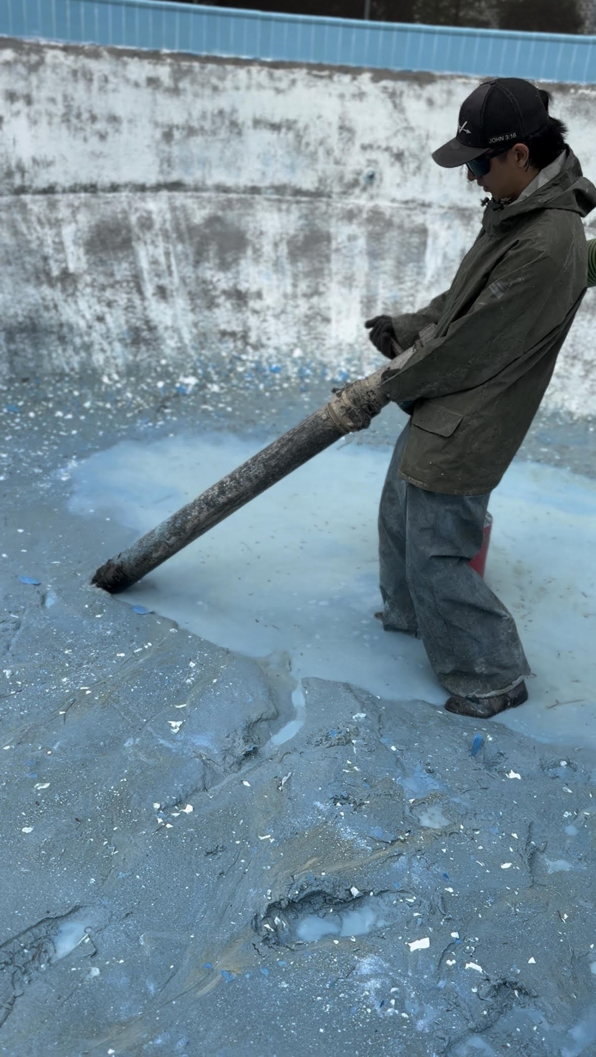 Once blasting is complete, we wet vac the entire pool floor and walls to pull out all loose blast media, slurry, and debris before it has a chance to dry and harden. We then follow up with a thorough pressure wash to flush out anything remaining from every corner, curve, and fitting. This two-step cleanup process is critical — any residue left behind can compromise how well the new finish bonds to the shell. We don't move on until the surface is completely clean and ready.